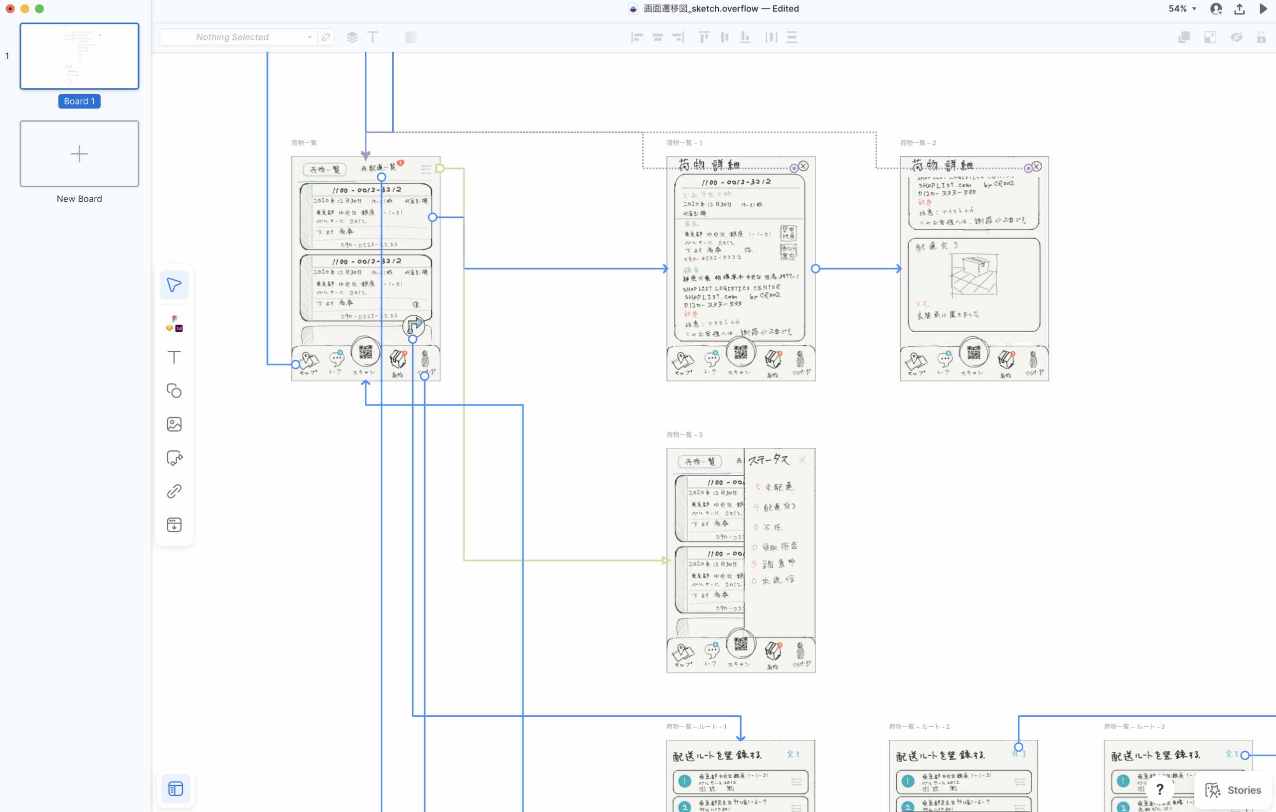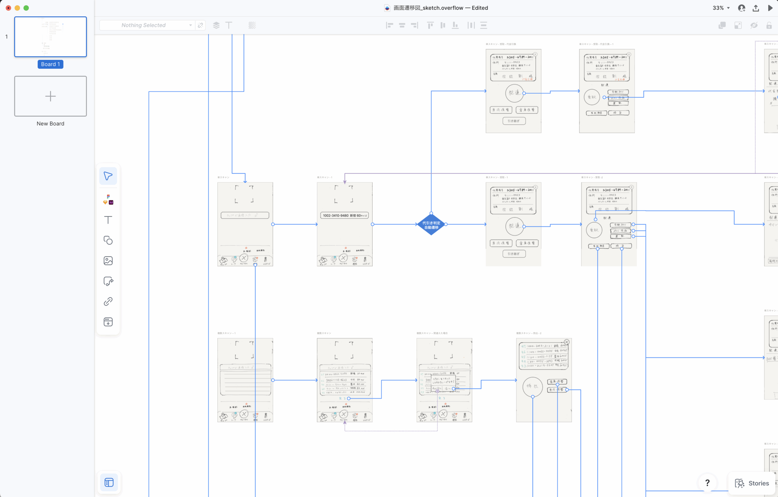 スケッチを描くだけではなく、描いたスケッチの画像を「Overflow」というシステム全体の画面遷移のフローを確認するアプリケーションを用いて構造を開発側と確認をしました。