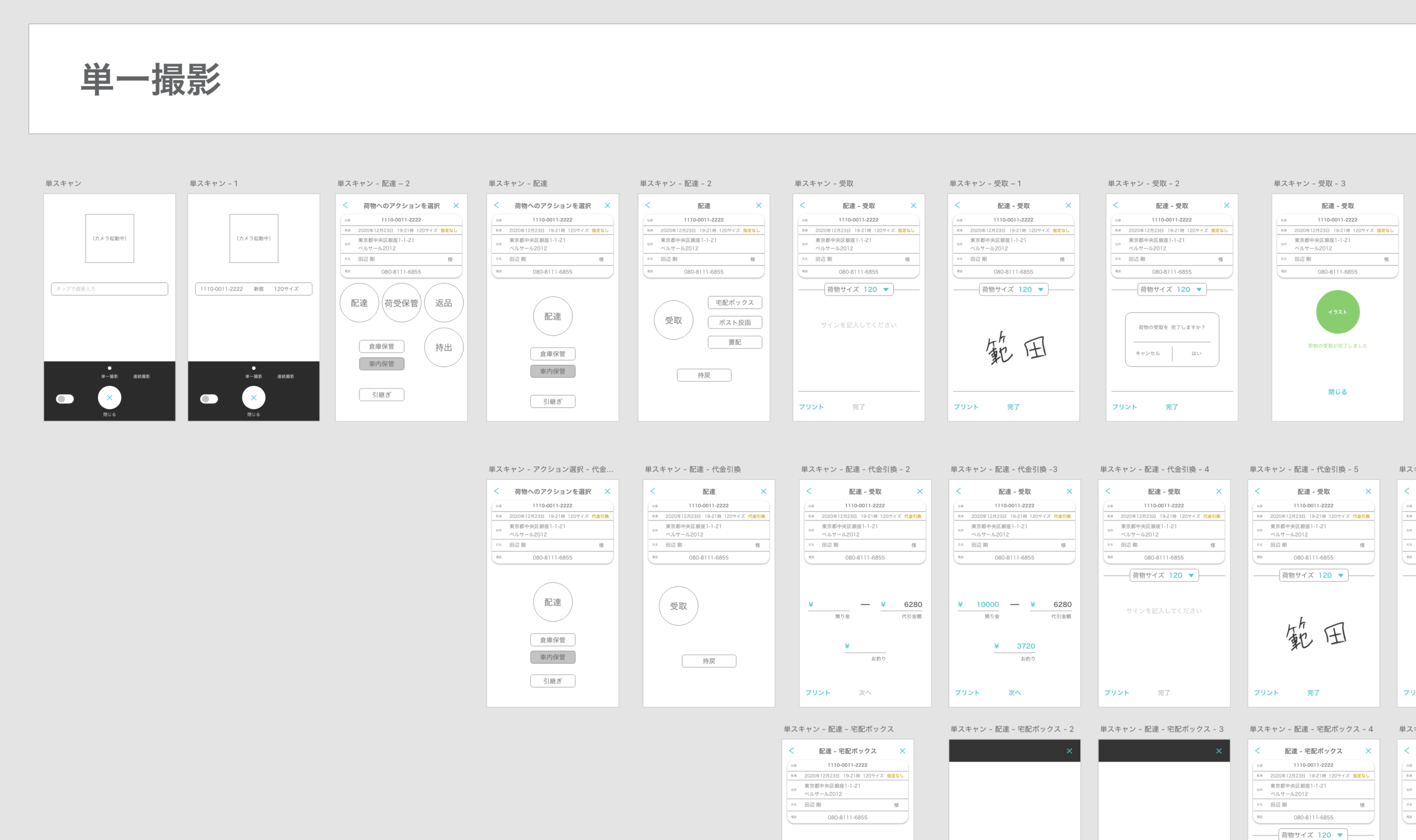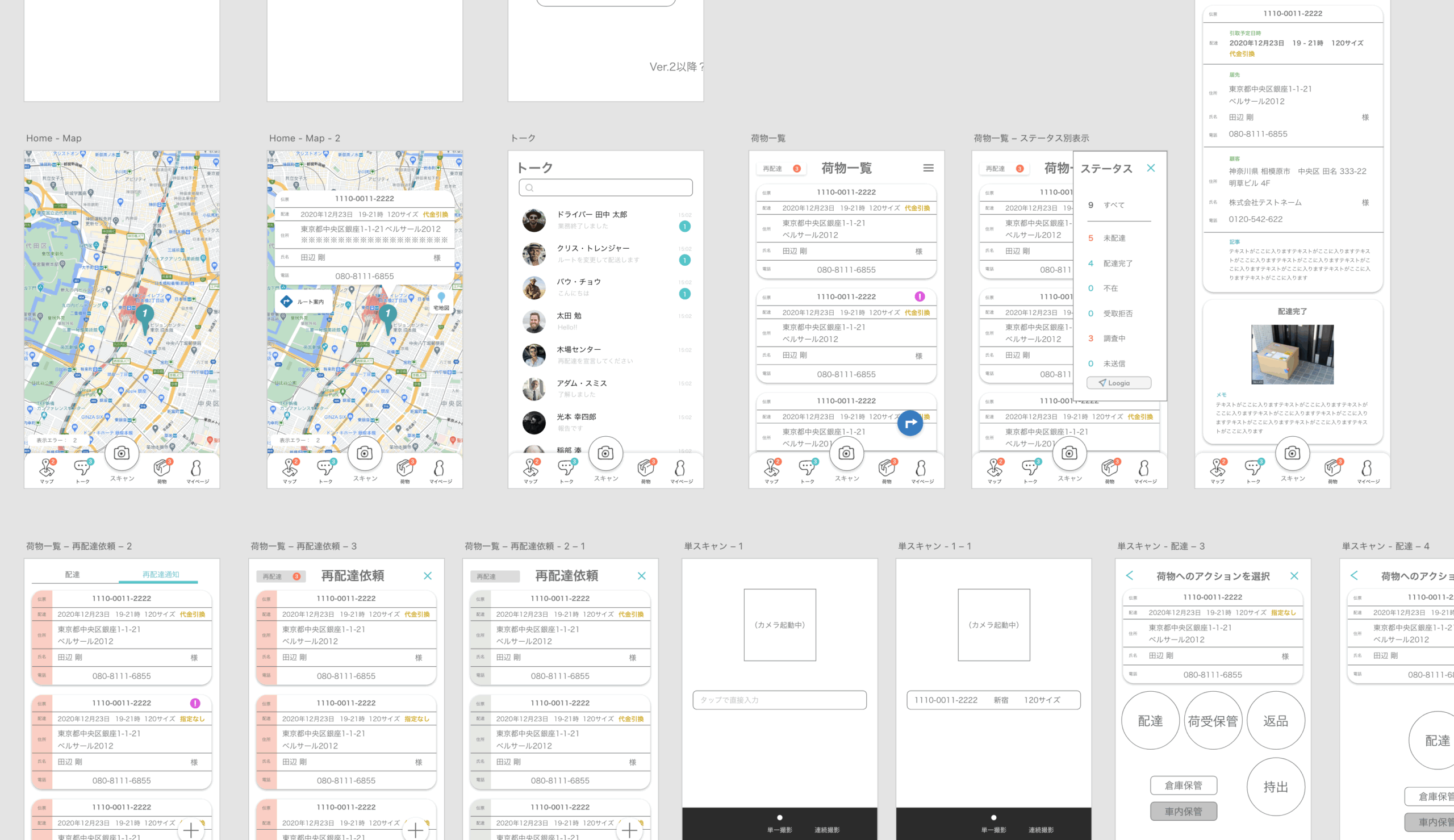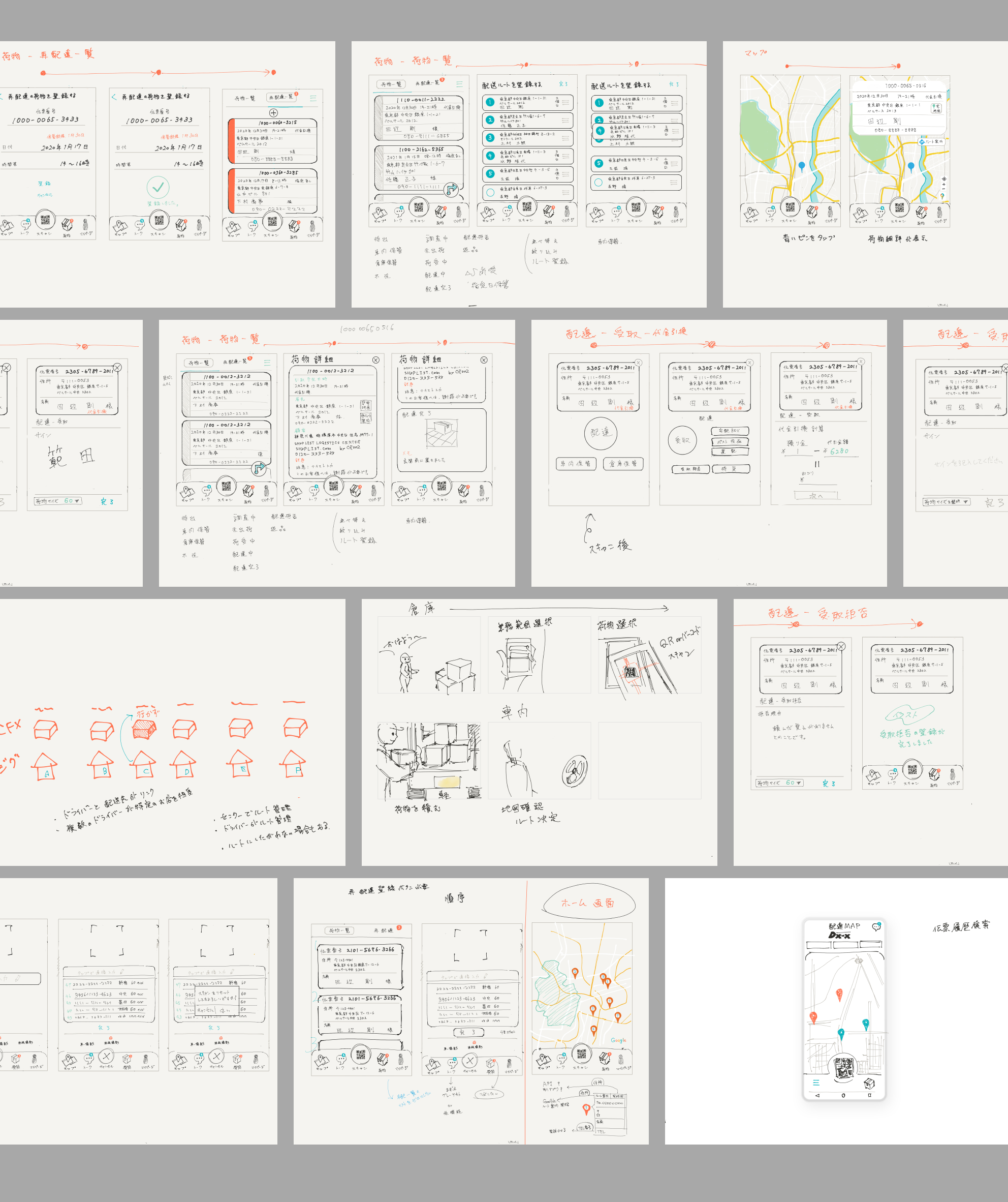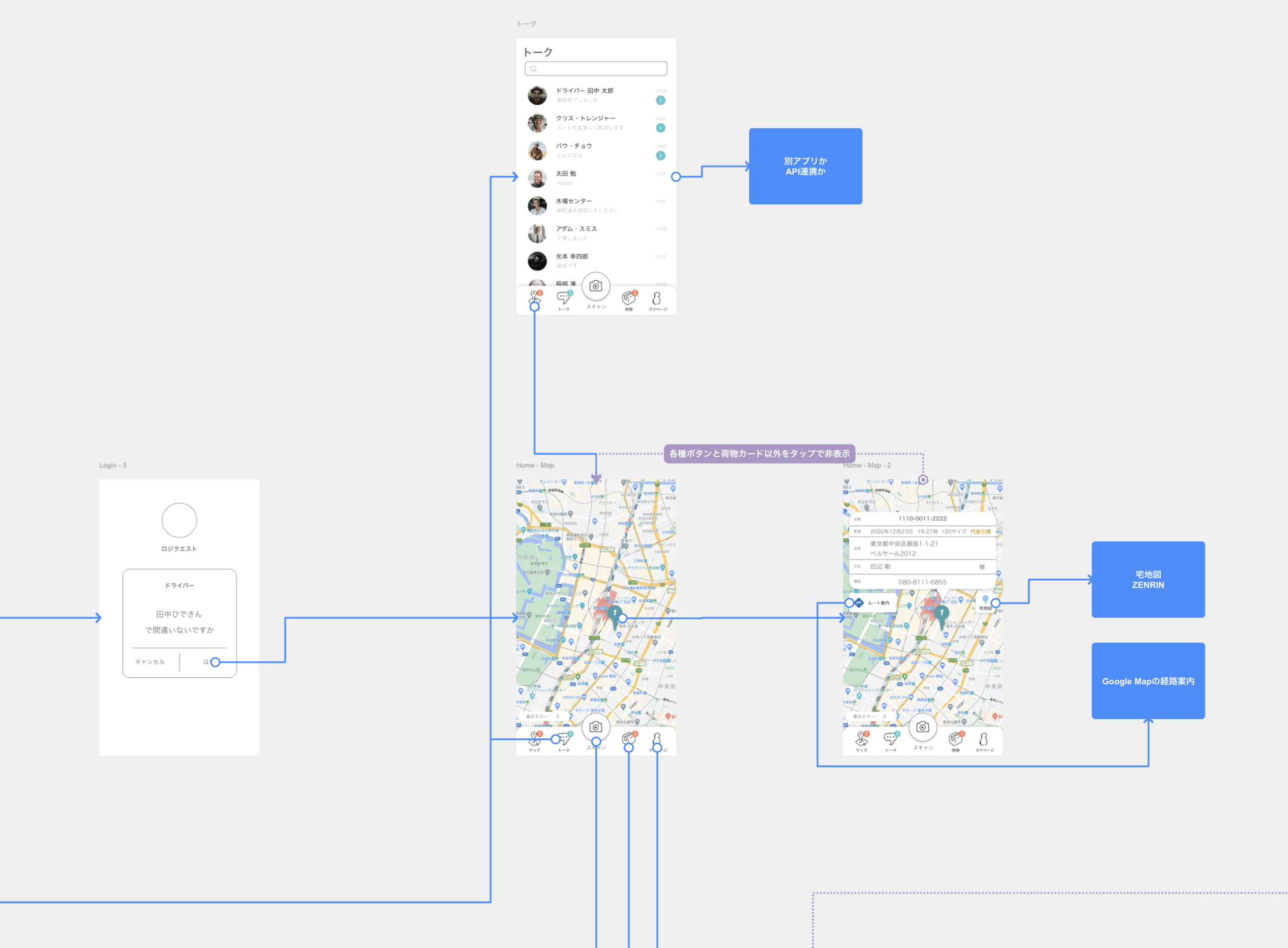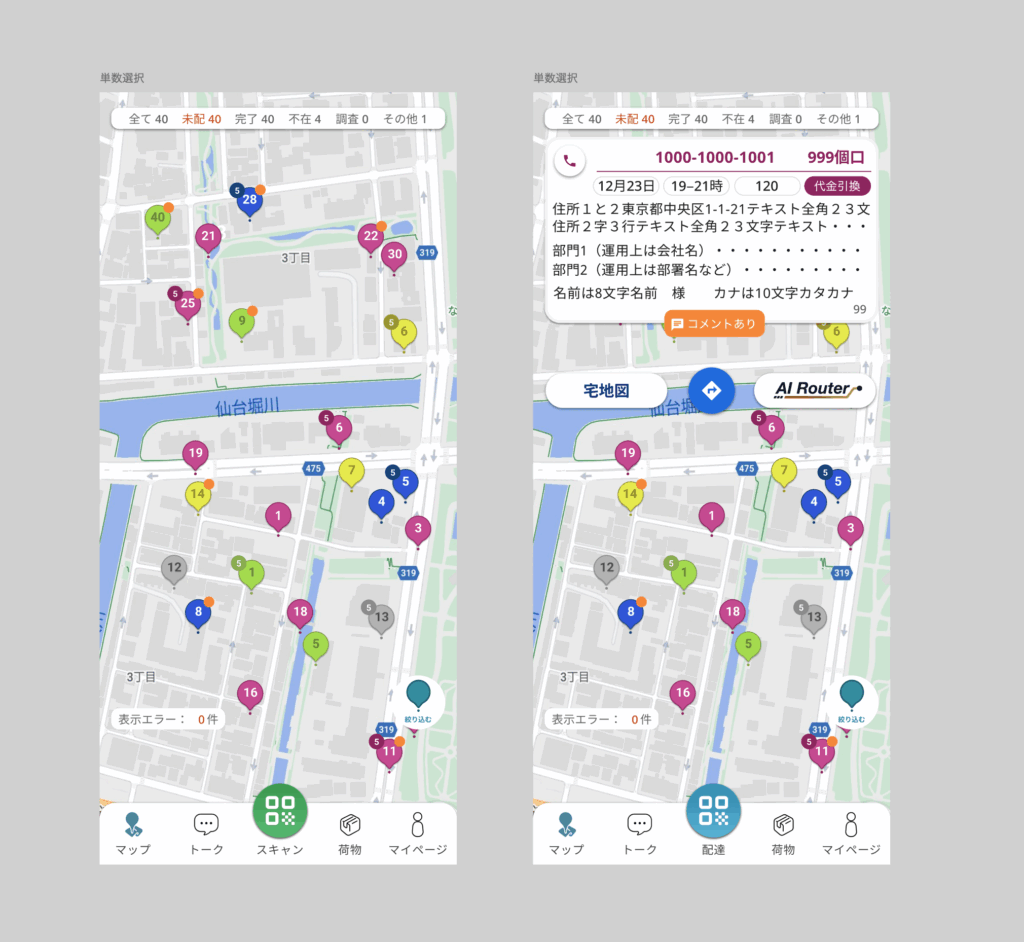 方針:オブジェクト指向UIデザインの思想をもちいて、「オブジェクトの選択」→「アクションの種類を選択」のようなプロセスになるように設計を行いました。具体的には「荷物をスキャン」→「配達をする」とったプロセスです。